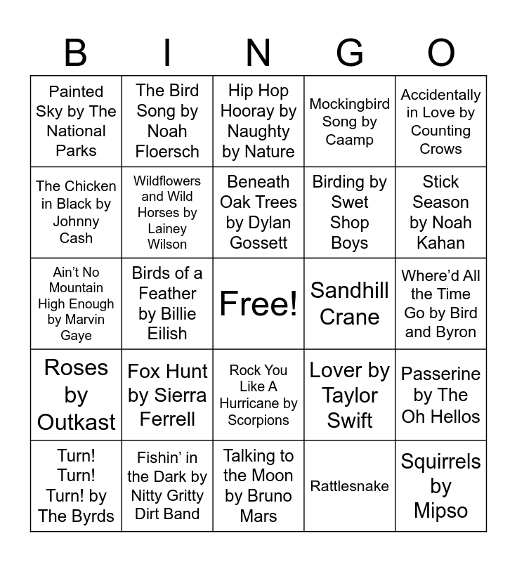 This bingo card has a free space and 75 words: Edge of Seventeen by Stevie Nicks, American Robin, Hip Hop Hooray by Naughty by Nature, Barracuda by Heart, Trees and Flowers by Strawberry Switchblade, Ragged Wood by Fleet Foxes, Daylight by Harry Styles, Heat Waves by Glass Animals, Red Fox, Red-tailed Hawk, Iris by The Goo Goo Dolls, Cruel Summer by Taylor Swift, Beneath Oak Trees by Dylan Gossett, The Chicken in Black by Johnny Cash, Dancing in the Moonlight by King Harvest, Birds of a Feather by Billie Eilish, Take Me Home, Country Roads by John Denver, Squirrels by Mipso, Snow by Red Hot Chili Peppers, Accidentally in Love by Counting Crows, Surfin’ Bird by The Trashmen, Ain’t No Mountain High Enough by Marvin Gaye, Wildflowers and Wild Horses by Lainey Wilson, The Bird Song by Noah Floersch, Mockingbird Song by Caamp, Red Dirt Road by Brooks & Dunn, Fly Away by Lenny Kravits, Waterfalls by TLC, One Headlight by The Wallflowers, Walking on Sunshine by Katrina & The Waves, Mr. Jones by Counting Crows, I Like Birds by Eels, Welcome to the Jungle by Guns N’ Roses, Lover by Taylor Swift, Stick Season by Noah Kahan, Birding by Swet Shop Boys, Riptide by Vance Joy, Pickin’ Wildflowers by Keith Anderson, Where’d All the Time Go by Bird and Byron, Rattlesnake, The Lion Sleeps Tonight by The Tokens, Foxglove by Haley Heynderickx, The Fox by Ylvis, Wild Thing by The Troggs, Forestry by Day We Ran, Free Bird by MOONLGHT, Turn! Turn! Turn! by The Byrds, Painted Sky by The National Parks, Northern Cardinal, American Toad, Crazy Bird by Wild Child, Rock You Like A Hurricane by Scorpions, September by Earth, Wind & Fire, Mr. Blue Sky by Weezer, Shake It Off by Taylor Swift, Rockin’ Robin by Bobby Day, Three Little Birds by Bob Marley & The Wailers, Feather by Sabrina Carpenter, Flowers by Miley Cyrus, Shrike by Hozier, Fox Hunt by Sierra Ferrell, Wildflowers by Trampled by Turtles, Blackbird by The Beatles, Take it Easy by Eagles, Wildflowers by Tom Petty, Sandhill Crane, Hymn for the Weekend by Coldplay, Wildlife by Alice Ivy, Hotel California by Eagles, Passerine by The Oh Hellos, Roses by Outkast, Fishin’ in the Dark by Nitty Gritty Dirt Band, Ivy by Taylor Swift, Talking to the Moon by Bruno Mars and Choking on Flowers by Fox Academy.