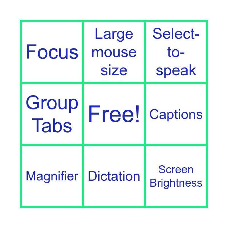 This bingo card has a free space and 8 words: Captions, Select-to-speak, Large mouse size, Magnifier, Focus, Screen Brightness, Group Tabs and Dictation.
