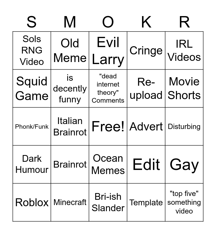 This bingo card has a free space and 24 words: Brainrot, Minecraft, "dead internet theory" Comments, Roblox, IRL Videos, Sols RNG Video, Squid Game, Old Meme, Advert, Ocean Memes, Re-upload, Phonk/Funk, Edit, Gay, is decently funny, Template, Disturbing, Evil Larry, Movie Shorts, Italian Brainrot, "top five" something video, Dark Humour, Cringe and Bri-ish Slander.