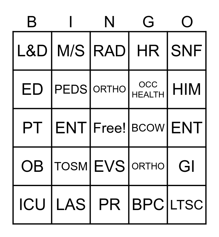 This bingo card has a free space and 24 words: TOSM, LAS, ORTHO, ICU, SNF, L&D, ED, M/S, BCOW, EVS, OCC HEALTH, PT, ORTHO, GI, PEDS, BPC, ENT, RAD, HIM, ENT, LTSC, OB, HR and PR.