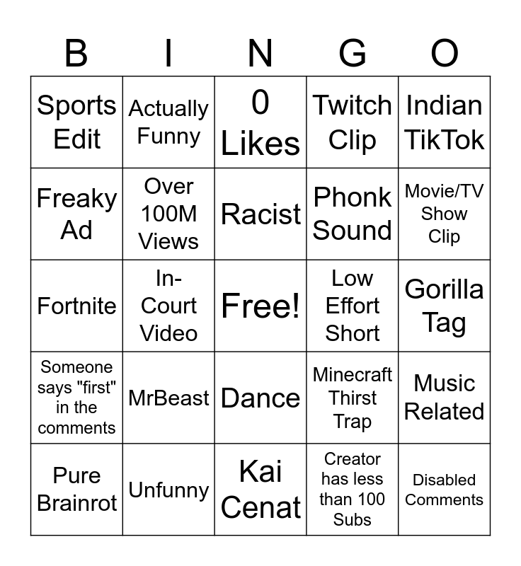 This bingo card has a free space and 24 words: MrBeast, Unfunny, Racist, Pure Brainrot, Indian TikTok, Sports Edit, Freaky Ad, Actually Funny, Low Effort Short, Dance, Phonk Sound, Fortnite, Minecraft Thirst Trap, Music Related, Over 100M Views, Creator has less than 100 Subs, Gorilla Tag, 0 Likes, Movie/TV Show Clip, In-Court Video, Disabled Comments, Someone says "first" in the comments, Twitch Clip and Kai Cenat.