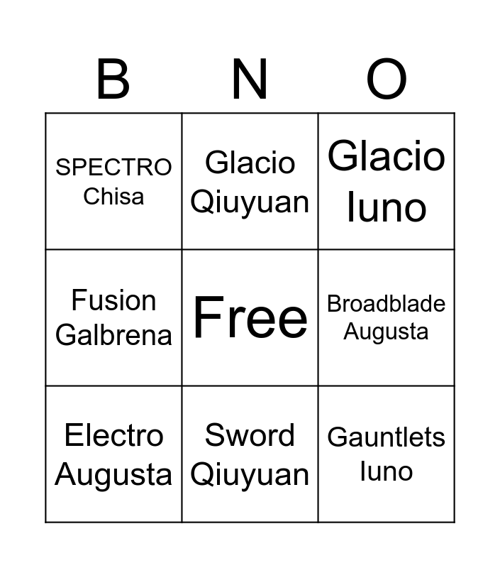 This bingo card has a free space and 9 words: Electro Augusta, Glacio Iuno, Glacio Qiuyuan, Fusion Galbrena, SPECTRO Chisa, Broadblade Augusta, Gauntlets Iuno, Sword Chisa and Sword Qiuyuan.