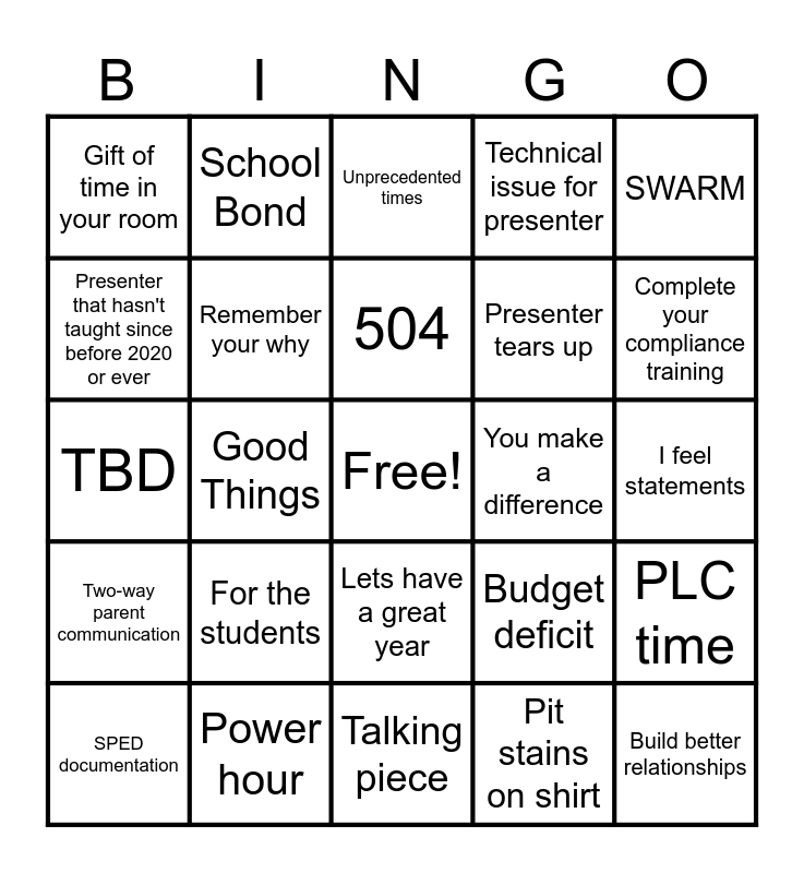 This bingo card has a free space and 30 words: Power hour, AVID, Good Things, Restorative Circles, Gift of time in your room, Unprecedented times, Remember your why, Lets have a great year, You make a difference, Talking piece, I feel statements, Build better relationships, Pit stains on shirt, Admin forgets a teacher's name or uses the wrong name, Complete your compliance training, Greatness Everywhere, Budget deficit, Two-way parent communication, For the students, SWARM, TBD, Teacher action, School Bond, Presenter tears up, Presenter that hasn't taught since before 2020 or ever, Technical issue for presenter, PLC time, SPED documentation, 504 and State requirement.