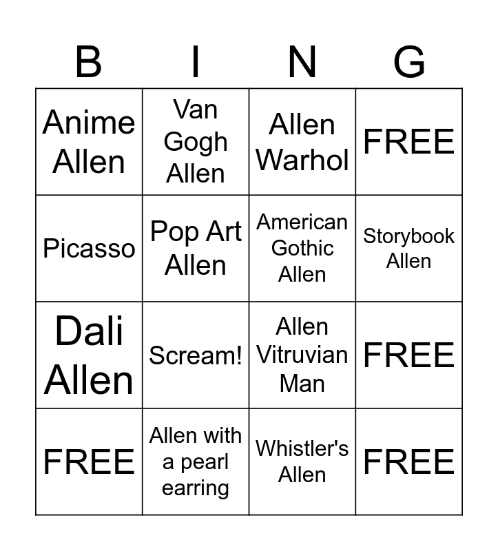 This bingo card has 25 words: Free!, Pixar Allen, Storybook Allen, Aardman Allen, Picasso, Anime Allen, Pop Art Allen, Van Gogh Allen, Allen with a pearl earring, Mona Allen, Dali Allen, Allen Vitruvian Man, Michelangelo's Allen, Frida Allen, American Gothic Allen, Legal tender?, Whistler's Allen, Allen Warhol, Scream!, FREE, FREE, FREE, FREE, FREE and ..