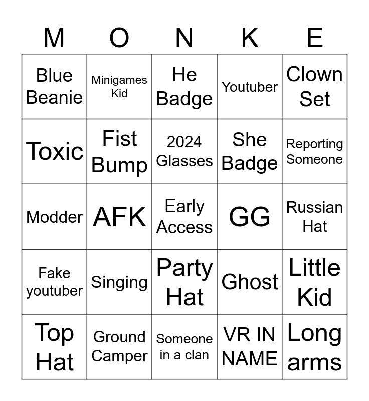 This bingo card has a free space and 24 words: Singing, Ground Camper, 2024 Glasses, Top Hat, Clown Set, Blue Beanie, Toxic, Minigames Kid, GG, Party Hat, She Badge, Modder, Ghost, Little Kid, Fist Bump, VR IN NAME, Russian Hat, He Badge, Reporting Someone, AFK, Long arms, Fake youtuber, Youtuber and Someone in a clan.