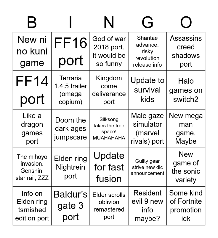 This bingo card has a free space and 24 words: Elden ring Nightrein port, Baldur’s gate 3 port, Kingdom come deliverance port, Info on Elden ring tsrnished edition port, Assassins creed shadows port, New ni no kuni game, FF14 port, FF16 port, Male gaze simulator (marvel rivals) port, Update for fast fusion, Update to survival kids, Like a dragon games port, Guilty gear strive new dlc announcement, New game of the sonic variety, Terraria 1.4.5 trailer (omega copium), Resident evil 9 new info maybe?, New mega man game. Maybe, God of war 2018 port. It would be so funny, Halo games on switch2, Doom the dark ages jumpscare, Some kind of Fortnite promotion idk, The mihoyo invasion. Genshin, star rail, ZZZ, Shantae advance: risky revolution release info and Elder scrolls oblivion remastered port.