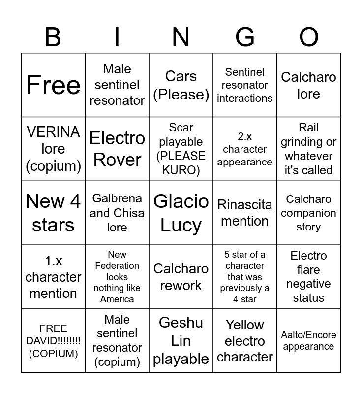 This bingo card has 25 words: New Federation looks nothing like America, Geshu Lin playable, Scar playable (PLEASE KURO), FREE DAVID!!!!!!!!(COPIUM), Calcharo lore, Free, VERINA lore (copium), Male sentinel resonator, Rinascita mention, Calcharo rework, 2.x character appearance, New 4 stars, 5 star of a character that was previously a 4 star, Electro flare negative status, Electro Rover, Aalto/Encore appearance, Calcharo companion story, Cars (Please), Rail grinding or whatever it's called, Galbrena and Chisa lore, Glacio Lucy, Male sentinel resonator (copium), 1.x character mention, Sentinel resonator interactions and Yellow electro character.