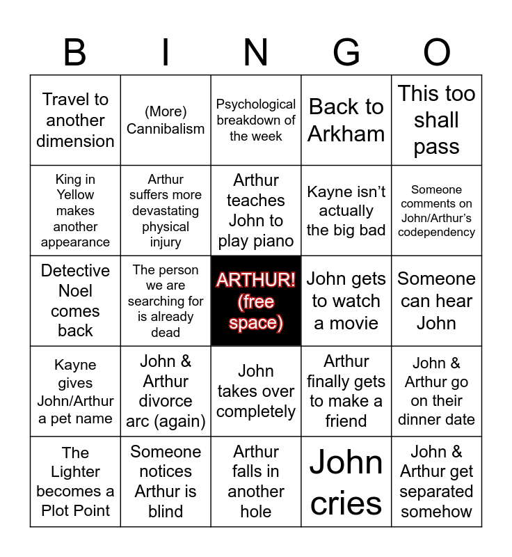 This bingo card has a free space and 24 words: John & Arthur divorce arc (again), Someone notices Arthur is blind, Arthur teaches John to play piano, The Lighter becomes a Plot Point, This too shall pass, Travel to another dimension, King in Yellow makes another appearance, (More) Cannibalism, John gets to watch a movie, John takes over completely, Kayne isn’t actually the big bad, Detective Noel comes back, Arthur finally gets to make a friend, John & Arthur go on their dinner date, Arthur suffers more devastating physical injury, John cries, Someone can hear John, Psychological breakdown of the week, Someone comments on John/Arthur’s codependency, The person we are searching for is already dead, John & Arthur get separated somehow, Kayne gives John/Arthur a pet name, Back to Arkham and Arthur falls in another hole.