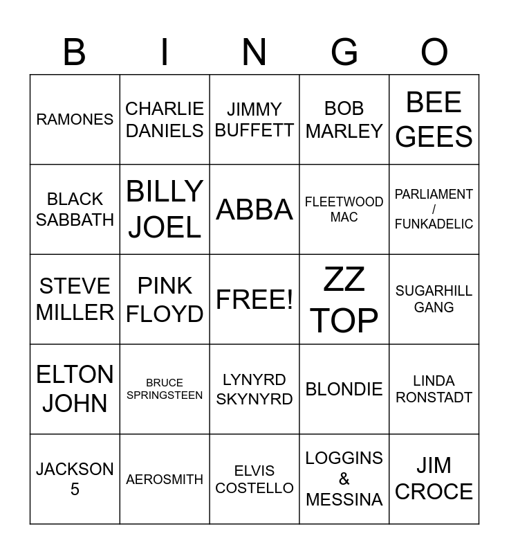 This bingo card has a free space and 39 words: CAROLE KING, BOB SEGER, GEORGE HARRISON, BILLY JOEL, JACKSON 5, LYNYRD SKYNYRD, ABBA, PETER FRAMPTON, BEE GEES, ELTON JOHN, PINK FLOYD, BOB MARLEY, JIM CROCE, SUGARHILL GANG, ZZ TOP, BRUCE SPRINGSTEEN, BARRY WHITE, RAMONES, BARRY MANILOW, BLONDIE, BLACK SABBATH, ELVIS COSTELLO, FLEETWOOD MAC, PARLIAMENT / FUNKADELIC, THE CLASH, LED ZEPPELIN, OLIVIA NEWTON-JOHN, ROD STEWART, ROBERTA FLACK, CHARLIE DANIELS, BOOMTOWN RATS, JONI MITCHELL, JIMMY BUFFETT, AEROSMITH, LOGGINS & MESSINA, SANTANA, LINDA RONSTADT, STEVE MILLER and NEIL YOUNG.