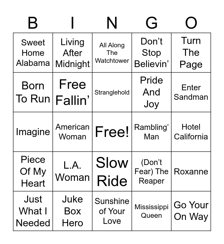 This bingo card has a free space and 80 words: Paranoid, Everybody Wants Some!!, All Along The Watchtower, Sweet Emotion, Kashmir, Gimme Shelter, Back In Black, A Day In The Life, Bohemian Rhapsody, Comfortably Numb, Baba O’Riley, Sweet Child O’ Mine, Don’t Stop Believin’, Sweet Home Alabama, Fortunate Son, Born To Run, Crazy Train, L.A. Woman, La Grange, Hotel California, Like A Rolling Stone, Turn The Page, Imagine, Stranglehold, Free Fallin’, Rock And Roll All Nite, Layla, More Than A Feeling, Space Oddity, Suite:Judy Blue Eyes, Enter Sandman, Smoke On The Water, Sunshine of Your Love, Rockin’ In The Free World, Just What I Needed, Rambling’ Man, Rocket Man, Live And Let Die, Sultans Of Swing, Go Your On Way, Barracuda, Feel Like Marin’s Love, Cocaine, I Want You To Want Me, Schools Out, Living After Midnight, The Boys Are Back In Town, Tom Sawyer, Black Water, Show Me The Way, Roxanne, American Woman, (Don’t Fear) The Reaper, All Right Now, Photograph, My Sweet Lord, Rocky Mountain Way, The Joker, Your Really Got Me, Slow Ride, Pride And Joy, Radar Love, Piano Man, Edge Of Seventeen, You Ain’t Seen Nothing Yet, In The Air Tonight, Home Sweet Home, The Boys Of The Summer, Maggie Mae, Burning Down The House, Piece Of My Heart, Juke Box Hero, Walk On The Wild Side, Blinded By The Light, For What It’s Worth, Hair Of The Dog, Mississippi Queen, A Horse With No Name, Let My Love Open The Door and Somebody To Love.