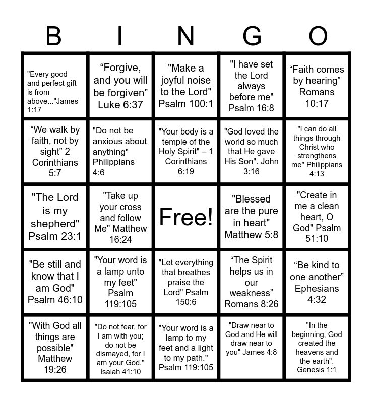 This bingo card has a free space and 39 words: "Christ is risen from the dead" 1 Corinthians 15:20, “He who endures to the end will be saved” Matthew 24:13, “The fruit of the Spirit is love, joy, peace…” Galatians 5:22, “The Spirit helps us in our weakness” Romans 8:26, “Be kind to one another” Ephesians 4:32, "Be still and know that I am God" Psalm 46:10, "Take up your cross and follow Me" Matthew 16:24, "Let your light so shine before men" Matthew 5:16, "Blessed are the pure in heart" Matthew 5:8, "Create in me a clean heart, O God" Psalm 51:10, “We walk by faith, not by sight” 2 Corinthians 5:7, “Forgive, and you will be forgiven” Luke 6:37, "The Lord is my light and my salvation" Psalm 27:1, "I can do all things through Christ who strengthens me" Philippians 4:13, "The Lord is my shepherd" Psalm 23:1, "Your word is a lamp unto my feet" Psalm 119:105, "Let everything that breathes praise the Lord" Psalm 150:6, "I have set the Lord always before me" Psalm 16:8, "Love one another as I have loved you" John 13:34, "With God all things are possible" Matthew 19:26, "Do not be anxious about anything" Philippians 4:6, "Your body is a temple of the Holy Spirit" – 1 Corinthians 6:19, "Draw near to God and He will draw near to you" James 4:8, “Faith comes by hearing” Romans 10:17, "Trust in the Lord with all your heart and lean not on your own understanding." Proverbs 3:5, "Do not fear, for I am with you; do not be dismayed, for I am your God." Isaiah 41:10, "Your word is a lamp to my feet and a light to my path." Psalm 119:105, "We love because He first loved us." 1 John 4:19, "God is our refuge and strength, an ever-present help in trouble." Psalm 46:1, "Every good and perfect gift is from above..."James 1:17, "For God has not given us a spirit of fear, but of power, love, and self-2 Timothy 1:7, "Love the Lord your God with all your heart and with all your soul and with all your mind." Matthew 22:37, "God loved the world so much that He gave His Son". John 3:16, "In the beginning, God created the heavens and the earth". Genesis 1:1, "When I am afraid, I will trust in You." Psalm 56:3, "Children, obey your parents in everything." Colossians 3:20, "Make a joyful noise to the Lord" Psalm 100:1, "I am wonderfully made" Psalm 139:14 and "Delight in the law of the Lord" Psalm 1:2.