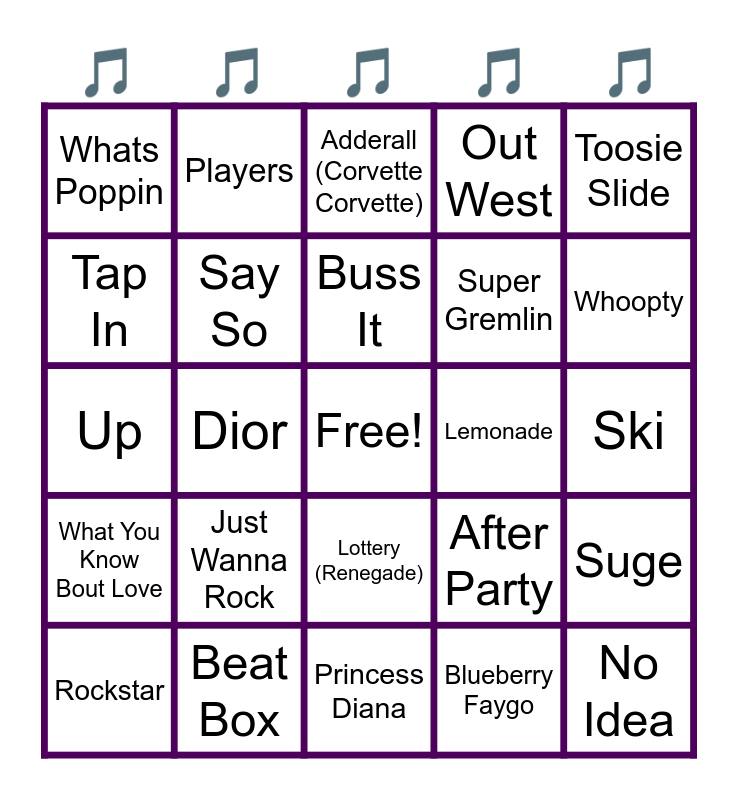 This bingo card has a free space and 35 words: Old Town Road, Roxanne, The Box, Say So, Lottery (Renegade), Out West, Tap In, Best Friend, Buss It, WAP, Up, Toosie Slide, Stunnin’, Mood, Whats Poppin, Lemonade, Blueberry Faygo, Dior, What You Know Bout Love, No Idea, After Party, Rockstar, Suge, Beat Box, Adderall (Corvette Corvette), Whoopty, Astronaut in the Ocean, Who Want Smoke??, Super Gremlin, Ski, Munch (Feelin’ U), Princess Diana, Just Wanna Rock, Players and FNF (Let’s Go).