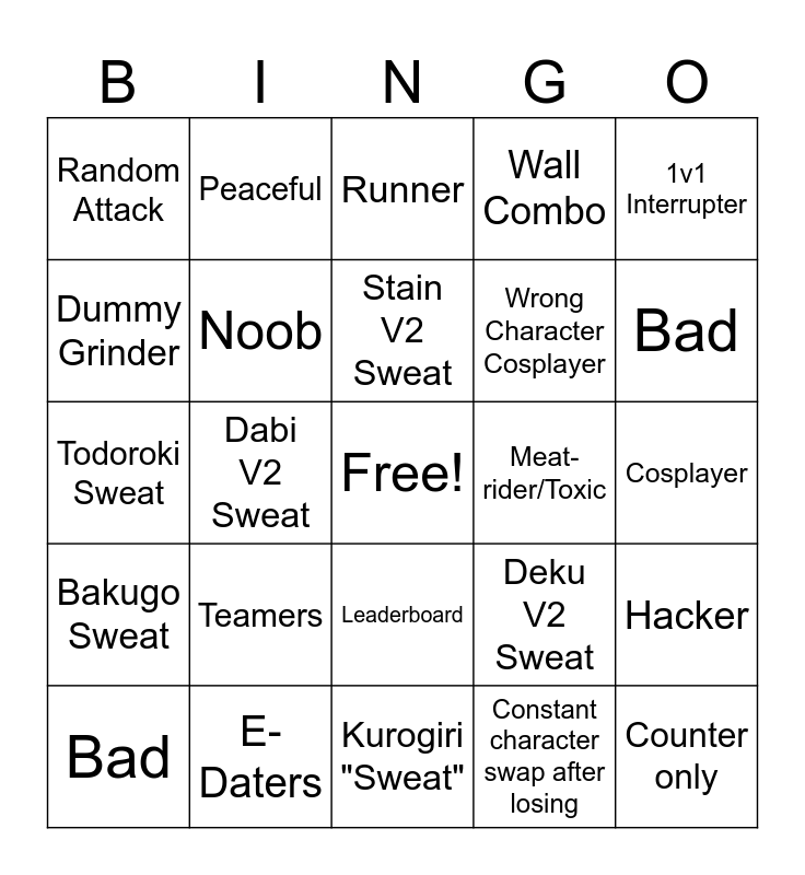 This bingo card has a free space and 24 words: Teamers, E-Daters, Stain V2 Sweat, Bad, 1v1 Interrupter, Random Attack, Dummy Grinder, Peaceful, Meat-rider/Toxic, Leaderboard, Wrong Character Cosplayer, Todoroki Sweat, Deku V2 Sweat, Hacker, Noob, Constant character swap after losing, Cosplayer, Runner, Bad, Dabi V2 Sweat, Counter only, Bakugo Sweat, Wall Combo and Kurogiri "Sweat".