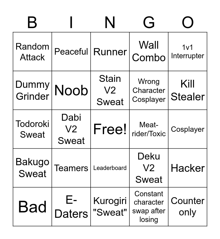 This bingo card has a free space and 24 words: Teamers, E-Daters, Stain V2 Sweat, Bad, 1v1 Interrupter, Random Attack, Dummy Grinder, Peaceful, Meat-rider/Toxic, Leaderboard, Wrong Character Cosplayer, Todoroki Sweat, Deku V2 Sweat, Hacker, Noob, Constant character swap after losing, Cosplayer, Runner, Kill Stealer, Dabi V2 Sweat, Counter only, Bakugo Sweat, Wall Combo and Kurogiri "Sweat".