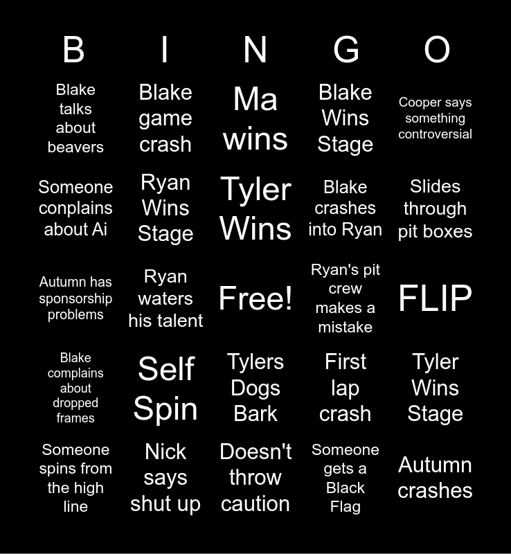 This bingo card has a free space and 51 words: Blake Says Moment, Autumn crashes, Autumn flips, Doesn't throw caution, Self Spin, Blakes wifi goes out, Blake game crash, Cooper Joins after stage 1, Someone conplains about Ai, Someone hates their setup, Ryan Wins Stage, Blake Wins Stage, Tyler Wins Stage, First lap crash, Blake wins, Ryan Wins, Tyler Wins, Ryan's pit crew makes a mistake, Blakes mom drops something in the background, Cooper says something controversial, Ryan waters his talent, Someone gets a Black Flag, Blake talks about beavers, Blake crashes into Ryan, Ai brake check, Autumn plays California girls, Slides through pit boxes, Nick yells at Bryson, Someone spins from the high line, Ma wins, Blake try’s to explain something, Autumn gets mad, Blake rants about 550, Cooper is on time, Ryan’s pit crew makes a mistake, Nick says shut up, Shaz unmutes, Ryan wins stage, Blake slides through pitbox, Last lap crash, FLIP, Blake complains about dropped frames, Someone gets stuck in the fence, Someone makes a measuring walls joke, Cooper yells at cash IRL, Someone complains about the AI not being realistic, Autumn has sponsorship problems, Ryan can’t speak English properly, Tyler says something therapeutic, Tylers Dogs Bark and AI gets OP at the end of the race.