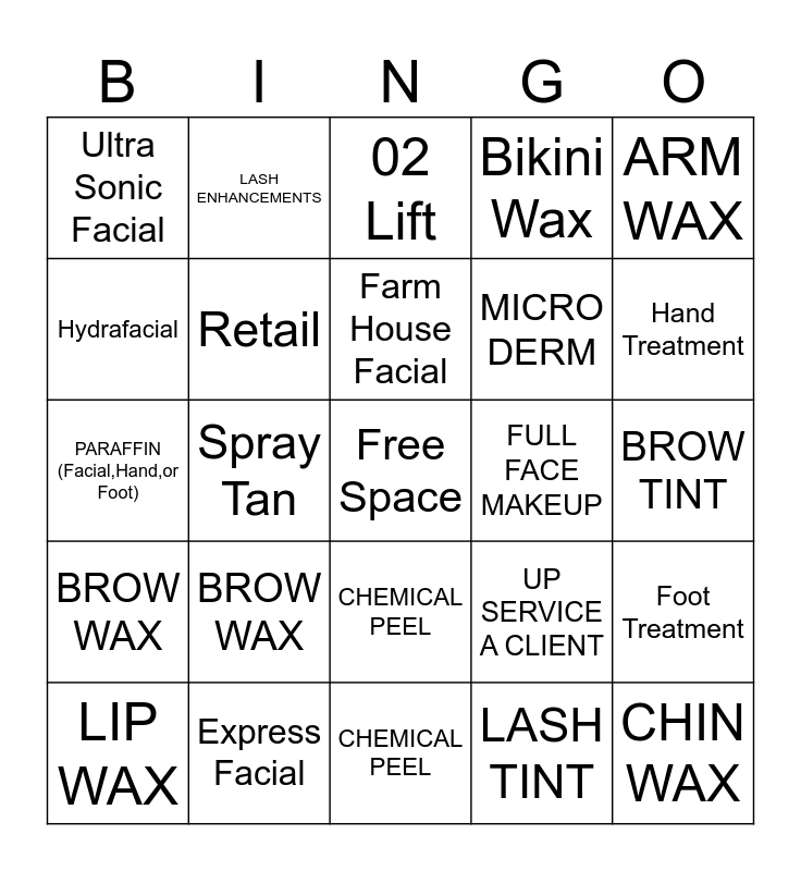 This bingo card has a free space and 24 words: BROW WAX, Express Facial, Farm House Facial, LIP WAX, ARM WAX, Ultra Sonic Facial, Hydrafacial, LASH ENHANCEMENTS, FULL FACE MAKEUP, CHEMICAL PEEL, MICRO DERM, PARAFFIN (Facial,Hand,or Foot), UP SERVICE A CLIENT, Foot Treatment, Retail, LASH TINT, BROW TINT, 02 Lift, Hand Treatment, Spray Tan, CHIN WAX, BROW WAX, Bikini Wax and CHEMICAL PEEL.