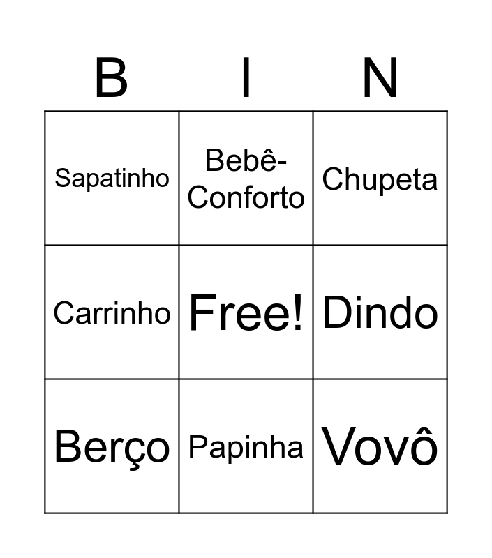 This bingo card has a free space and 29 words: Papai, Mamãe, Família, Body, Sapatinho, Chupeta, Berço, Macacão, Shampoo, Lenço Umedecido, Toalha de Banho, Mordedor, Algodão, Banheira, Manta, Cotonete, Cueiro, Vovó, Vovô, Joaninha, Mamadeira, Móbile, Dinda, Dindo, Carrinho, Bebê-Conforto, Fralda, Papinha and Tetê.