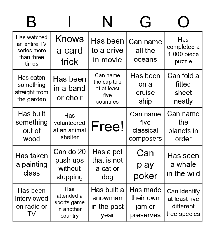 This bingo card has a free space and 24 words: Can do 20 push ups without stopping, Has attended a sports game in another country, Can name the capitals of at least five countries, Has been interviewed on radio or TV, Has completed a 1,000 piece puzzle, Has watched an entire TV series more than three times, Has eaten something straight from the garden, Knows a card trick, Can name five classical composers, Has a pet that is not a cat or dog, Has been on a cruise ship, Has built something out of wood, Can play poker, Has seen a whale in the wild, Has been in a band or choir, Has made their own jam or preserves, Can name the planets in order, Has been to a drive in movie, Can fold a fitted sheet neatly, Has volunteered at an animal shelter, Can identify at least five different tree species, Has taken a painting class, Can name all the oceans and Has built a snowman in the past year.