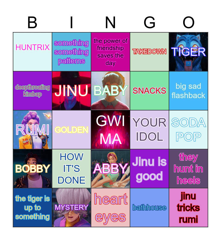 This bingo card has 12 images and 40 words: ZOEY, RUMI, MIRA, JINU, MYSTERY, ABBY, BABY, ROMANCE, TIGER, BOBBY, GOLDEN, TAKEDOWN, GWI MA, SODA POP, YOUR IDOL, HOW IT'S DONE, SAJA BOYS, HUNTRIX, RAMEN, the power of friendship saves the day, they hunt in heels, bathhouse, SNACKS, deepthroating kimbap, "unnie!", rabid fans, buff male fans, they use magic!, jinu tricks rumi, birb, Free! (the song, not the space), the tiger is up to something, Jinu is evil, Jinu is good, big sad flashback, heart eyes, Celine is Lea Salonga, creepy child singing, something something patterns and someone rants about demons.