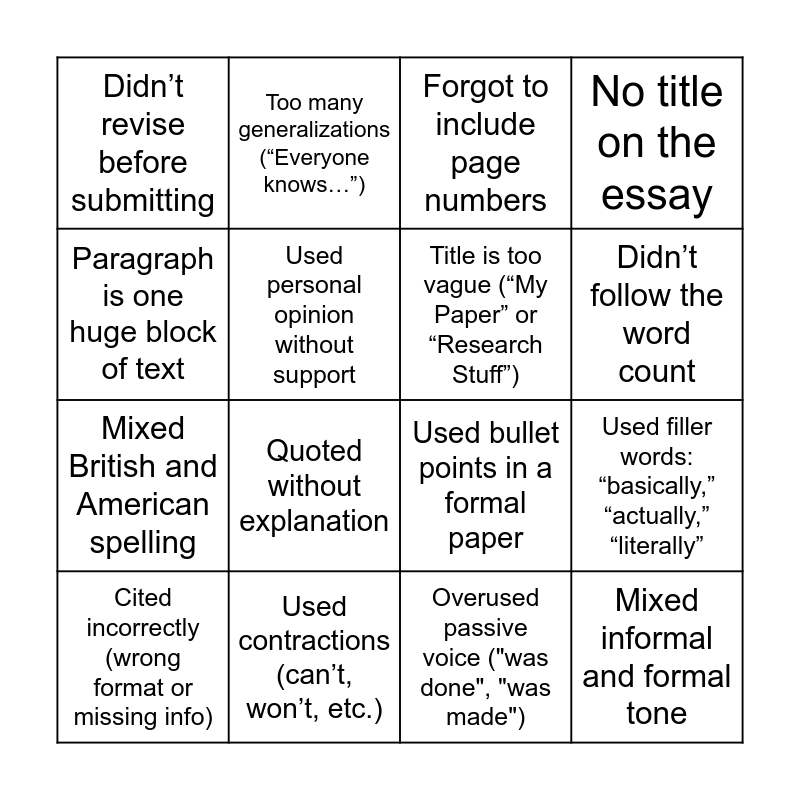 This bingo card has 16 words: Used contractions (can’t, won’t, etc.), Used filler words: “basically,” “actually,” “literally”, Forgot to include page numbers, Didn’t revise before submitting, Mixed British and American spelling, Too many generalizations (“Everyone knows…”), Used bullet points in a formal paper, Overused passive voice ("was done", "was made"), Paragraph is one huge block of text, Used personal opinion without support, Cited incorrectly (wrong format or missing info), No title on the essay, Quoted without explanation, Didn’t follow the word count, Title is too vague (“My Paper” or “Research Stuff”) and Mixed informal and formal tone.
