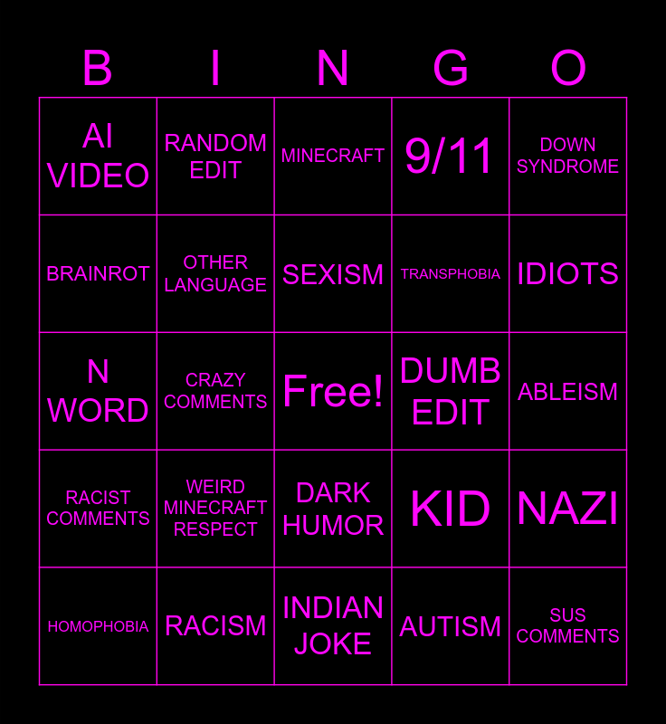 This bingo card has a free space and 24 words: WEIRD MINECRAFT RESPECT, RACISM, SEXISM, HOMOPHOBIA, DOWN SYNDROME, AI VIDEO, BRAINROT, RANDOM EDIT, DUMB EDIT, DARK HUMOR, TRANSPHOBIA, N WORD, KID, NAZI, OTHER LANGUAGE, AUTISM, ABLEISM, MINECRAFT, IDIOTS, CRAZY COMMENTS, SUS COMMENTS, RACIST COMMENTS, 9/11 and INDIAN JOKE.