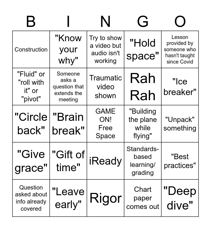 This bingo card has a free space and 24 words: "Gift of time", "Leave early", Traumatic video shown, Question asked about info already covered, Lesson provided by someone who hasn't taught since Covid, Construction, "Fluid" or "roll with it" or "pivot", "Know your why", "Building the plane while flying", iReady, Rah Rah, "Circle back", Standards-based learning/ grading, "Best practices", Someone asks a question that extends the meeting, Chart paper comes out, "Unpack" something, Try to show a video but audio isn't working, "Ice breaker", "Brain break", "Deep dive", "Give grace", "Hold space" and Rigor.
