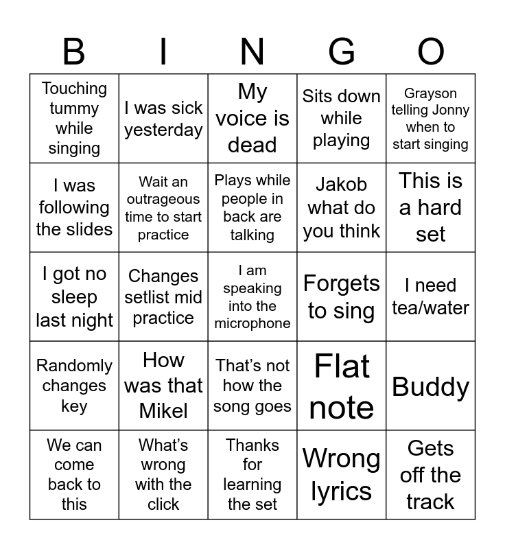 This bingo card has a free space and 24 words: How was that Mikel, What’s wrong with the click, Plays while people in back are talking, We can come back to this, Grayson telling Jonny when to start singing, Touching tummy while singing, I was following the slides, I was sick yesterday, Forgets to sing, That’s not how the song goes, Jakob what do you think, I got no sleep last night, Flat note, Buddy, Wait an outrageous time to start practice, Wrong lyrics, I need tea/water, My voice is dead, This is a hard set, Changes setlist mid practice, Gets off the track, Randomly changes key, Sits down while playing and Thanks for learning the set.