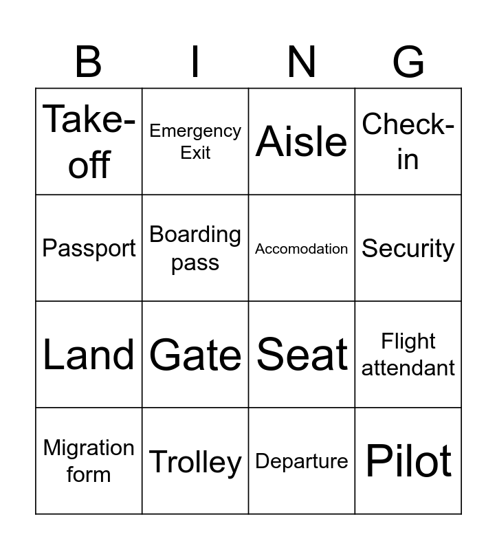 This bingo card has 16 words: Trolley, Flight attendant, Aisle, Take-off, Land, Emergency Exit, Seat, Departure, Passport, Boarding pass, Migration form, Check-in, Gate, Security, Accomodation and Pilot.