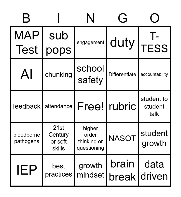 This bingo card has a free space and 43 words: PLC, data driven, 504, IEP, AWARE, brain break, engagement, relationships, T-TESS, best practices, duty, rubric, higher order thinking or questioning, 21st Century or soft skills, interventions or RTI, growth mindset, social emotional or SEL, feedback, reteach/ retest, accountability, sub pops, closing the gaps, eco dis, MAP Test, check for understanding, student to student talk, lesson frames, writing across curriculum, NASOT, bloodborne pathogens, college and career ready, student growth, Skyward, attendance, parent contact, standards based, equity, school safety, AI, Differentiate, scaffold, chunking and accommodations.