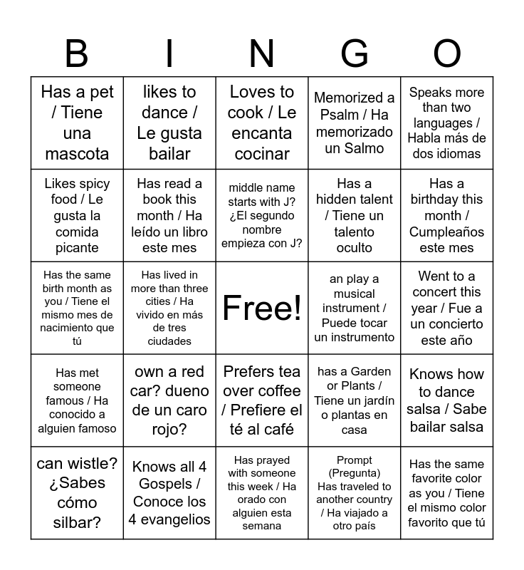 This bingo card has a free space and 24 words: can wistle?¿Sabes cómo silbar?, own a red car? dueno de un caro rojo?, middle name starts with J?¿El segundo nombre empieza con J?, Prompt (Pregunta) Has traveled to another country / Ha viajado a otro país, Speaks more than two languages / Habla más de dos idiomas, Has a pet / Tiene una mascota, likes to dance / Le gusta bailar, Loves to cook / Le encanta cocinar, an play a musical instrument / Puede tocar un instrumento, Went to a concert this year / Fue a un concierto este año, Has the same birth month as you / Tiene el mismo mes de nacimiento que tú, Has read a book this month / Ha leído un libro este mes, has a Garden or Plants / Tiene un jardín o plantas en casa, Knows how to dance salsa / Sabe bailar salsa, Likes spicy food / Le gusta la comida picante, Knows all 4 Gospels / Conoce los 4 evangelios, Has prayed with someone this week / Ha orado con alguien esta semana, Memorized a Psalm / Ha memorizado un Salmo, Has a birthday this month / Cumpleaños este mes, Has met someone famous / Ha conocido a alguien famoso, Has lived in more than three cities / Ha vivido en más de tres ciudades, Prefers tea over coffee / Prefiere el té al café, Has a hidden talent / Tiene un talento oculto and Has the same favorite color as you / Tiene el mismo color favorito que tú.