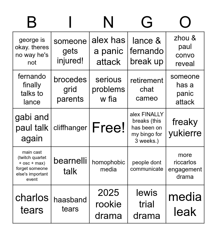 This bingo card has a free space and 24 words: bearnelli talk, haasband tears, serious problems w fia, charlos tears, zhou & paul convo reveal, george is okay. theres no way he's not, fernando finally talks to lance, someone gets injured!, alex FINALLY breaks (this has been on my bingo for 3 weeks.), homophobic media, retirement chat cameo, gabi and paul talk again, people dont communicate, more riccarlos engagement drama, brocedes grid parents, lewis trial drama, freaky yukierre, alex has a panic attack, someone has a panic attack, cliffhanger, media leak, main cast (twitch quartet + osc + max) forget someone else's important event, lance & fernando break up and 2025 rookie drama.