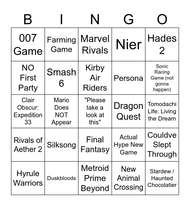 This bingo card has a free space and 24 words: Silksong, Duskbloods, Kirby Air Riders, Hyrule Warriors, Hades 2, 007 Game, NO First Party, Farming Game, Dragon Quest, Final Fantasy, Persona, Clair Obscur: Expedition 33, Actual Hype New Game, Couldve Slept Through, Smash 6, New Animal Crossing, Tomodachi Life: Living the Dream, Marvel Rivals, Sonic Racing Game (not gonna happen), Mario Does NOT Appear, Stardew / Haunted Chocolatier, Rivals of Aether 2, Nier and Metroid Prime Beyond.
