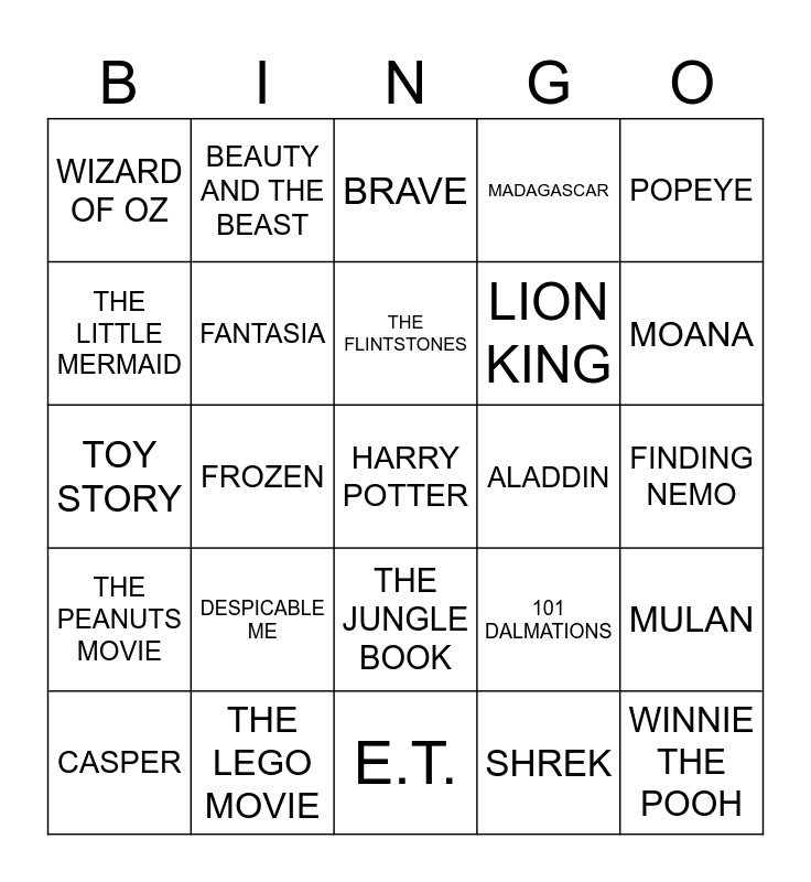This bingo card has 25 words: DESPICABLE ME, E.T., THE FLINTSTONES, CASPER, POPEYE, WIZARD OF OZ, THE LITTLE MERMAID, BEAUTY AND THE BEAST, ALADDIN, THE JUNGLE BOOK, LION KING, TOY STORY, 101 DALMATIONS, MULAN, FANTASIA, WINNIE THE POOH, FINDING NEMO, BRAVE, MOANA, FROZEN, HARRY POTTER, THE LEGO MOVIE, THE PEANUTS MOVIE, MADAGASCAR and SHREK.