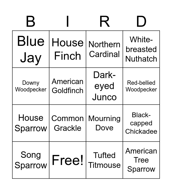 This bingo card has 16 words: Free!, Black-capped Chickadee, Northern Cardinal, Blue Jay, House Sparrow, House Finch, Mourning Dove, Tufted Titmouse, Downy Woodpecker, American Goldfinch, Song Sparrow, White-breasted Nuthatch, Common Grackle, Red-bellied Woodpecker, Dark-eyed Junco and American Tree Sparrow.