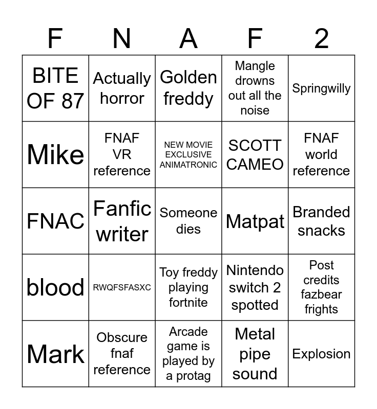 This bingo card has a free space and 24 words: RWQFSFASXC, Obscure fnaf reference, NEW MOVIE EXCLUSIVE ANIMATRONIC, Mark, Springwilly, BITE OF 87, Mike, Actually horror, Matpat, Toy freddy playing fortnite, SCOTT CAMEO, FNAC, Nintendo switch 2 spotted, Post credits fazbear frights, FNAF VR reference, Metal pipe sound, Branded snacks, Golden freddy, FNAF world reference, Fanfic writer, Explosion, blood, Mangle drowns out all the noise and Arcade game is played by a protag.