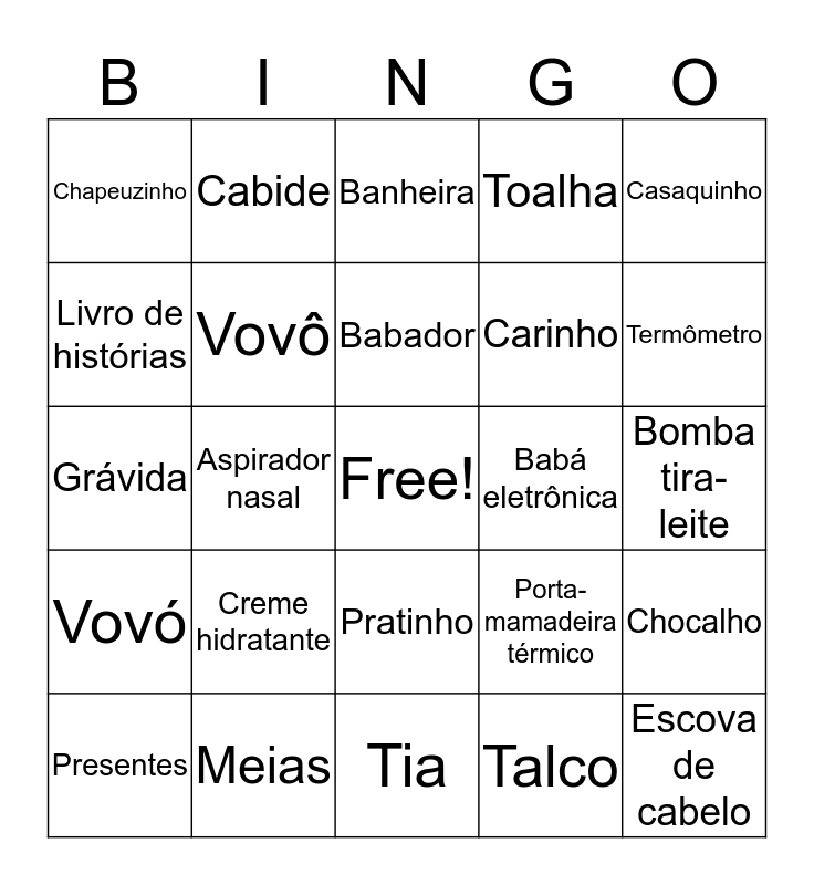 This bingo card has a free space and 100 words: Álbum de fotos, Canção de Ninar, Bomba tira-leite, Mamãe, Protetor de tomada, Algodão, Canguru, Família, Maternidade, Protetor Solar, Amamentar, Protetor de carrinho, Felicidade, Meias, Sabonete, Amigos, Carinho, Fraldas, Móbile, Saboneteira, Amor, Carrinho, Boneca, Mochila, Camiseta, Babá eletrônica, Casaquinho, Porta-mamadeira térmico, Mordedor, Shampoo, Aspirador nasal, Chapeuzinho, Gorrinho, Mosquiteiro, Talco, Babador, Chocalho, Gestação, Nascimento, Tapete, Copo, Chupeta, Grávida, Hipoglós, Termômetro, Banheira, Manta, Joelheira, Padrinho, Tia, Bebê, Colônia, Pula-pula, Papai, Tio, Cadeirinha para carro, Condicionador, Leite, Papinha, Toalha, Berço, Cotonete, Lembrancinha, Pente, Travesseiro, Macacão, Brotoeja, Lenços umedecidos, Pinça higiênica, Trocador, Bolsa térmica, Creme hidratante, Lençól, Porta-chupeta, Ultrassom, Brincadeiras, Engatinhar, Livro de histórias, Posicionador para dormir, Umidificador, Brinquedos, Escova de cabelo, Luvas, Pratinho, Ursinho, Cabide, Escova de mamadeira, Body, Prendedor de chupeta, Vovó, Poltrona, Esponja de banho, Madrinha, Presentes, Vovô, Culote, Esterilizador, Mamadeira, Proteção and Colher.
