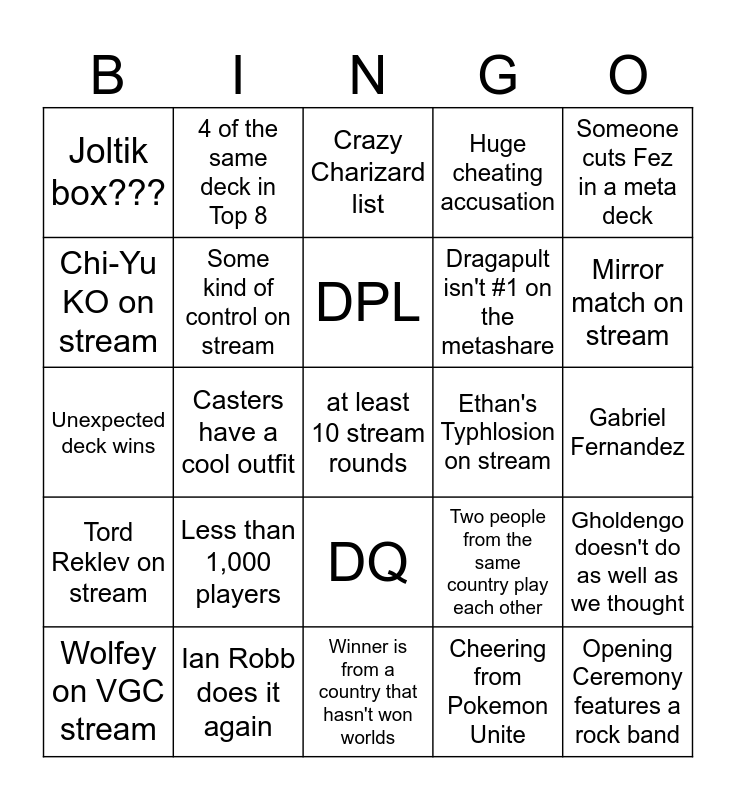 This bingo card has a free space and 28 words: Gholdengo doesn't do as well as we thought, Japanese player in top 4, Dragapult isn't #1 on the metashare, Cheering from Pokemon Unite, Chi-Yu KO on stream, Crazy Charizard list, 4 of the same deck in Top 8, Tord Reklev on stream, Ethan's Typhlosion on stream, Wolfey on VGC stream, Unexpected deck wins, Huge cheating accusation, Ian Robb does it again, Winner is from a country that hasn't won worlds, Mirror match on stream, Game-winning coin flip, Less than 1,000 players, Some kind of control on stream, DPL, DQ, Joltik box???, Ace Nullifier Genesect in two different decks, Opening Ceremony features a rock band, Casters have a cool outfit, Gabriel Fernandez, Two people from the same country play each other, Someone cuts Fez in a meta deck and No Gardevoir in top 4.