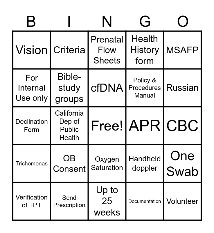 This bingo card has a free space and 79 words: homeless, Medical Assistant, Prenatal Flow Sheets, OB Visit Established, Texas, at least annually, Chlamydia, Sonographer, Rhogam shot, Standing Orders, OB Panel, faith, Health History form, Vision, "Back phone number", For Internal Use only, check your state regulations, OB Consent, encourage to apply for insurance, CBC, glucose screening, MSAFP, Declination Form, cfDNA, Bible-study groups, OB blood draw, may take 45 minutes, Four Languages, Spanish, Dari, Russian, Medical Referral List, Up to 25 weeks, mandatory, Verification of +PT, APR, Abortion-Minded, Abortion-Vulnerable, OB Care Provider, Volunteer, Physician Assistant, Agreement, Nurse Practitioner, Receptionist, Back-to-back, Criteria, Double-sided Application, Quest Lab, Center for Disease Detection, affordable prices, One Swab, California Dep of Public Health, Handheld doppler, Blood Pressure, Weight Scales, Centrifuge, Medical Refrigerator, Phlebotomy Chair, Phlebotomy Cart, Oxygen Saturation, Policy & Procedures Manual, Free Lunch Box, OB Application, OB Consent form, Certified Interpreter, File #1234, Gonorrhea, Yeast Infection, nausea, Trichomonas, Send Prescription, Physician Phone Prescription, BV, Pack of 200 sheets, Philippians 4:13, Documentation, Reach out for a sample, Thermometer and Pregnancy Test.