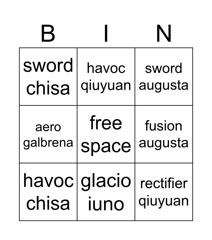 This bingo card has a free space and 8 words: fusion augusta, sword augusta, havoc qiuyuan, havoc chisa, sword chisa, rectifier qiuyuan, aero galbrena and glacio iuno.