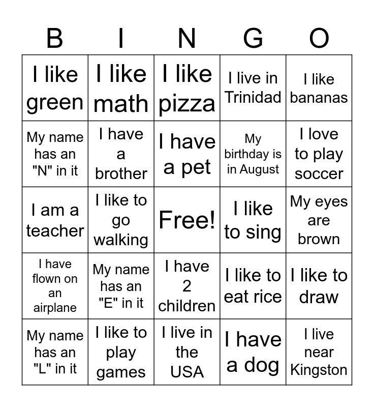 This bingo card has a free space and 34 words: I like to read, I have a dog, I am left handed, I have a sister, I have flown on an airplane, I have a brother, I like bananas, My name has an "L" in it, I like math, I know how to swim, I have a pet, I like pizza, I have nieces, I like to cook, I like to sing, I love to play soccer, I like to play games, I am a teacher, My name has an "E" in it, I like to eat rice, I have 2 children, I love ice cream, I like green, My eyes are brown, I live in the USA, I live near Kingston, I live in Trinidad, I am a student, My birthday is in August, My name has an "N" in it, I know how to drive a car, I like to go walking, I like to draw and I know how to type.