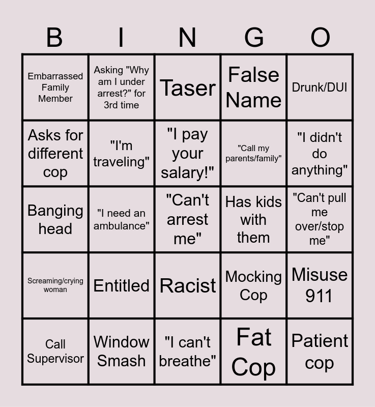 This bingo card has a free space and 39 words: "I know my rights!", *spits*, Weed, "I'm traveling", Call Supervisor, Racist, "I pay your salary!", "Go solve real crime", Drunk/DUI, Screaming/crying woman, "I need an ambulance", False Name, Patient cop, "Can't pull me over/stop me", Has kids with them, Entitled, "You're White", Embarrassed Family Member, "Do you know who I am?", Mocking Cop, Asks for different cop, "I can't breathe", "Call my parents/family", "I didn't do anything", "You're getting fired!", Threats to officer, "Calling my lawyer", "You're hurting me!", Assaulting Officer, Asking "Why am I under arrest?" for 3rd time, Tantrum, WRAP Restraint, Taser, Window Smash, Fat Cop, OC Spray, Misuse 911, Banging head and "My family member is a cop".