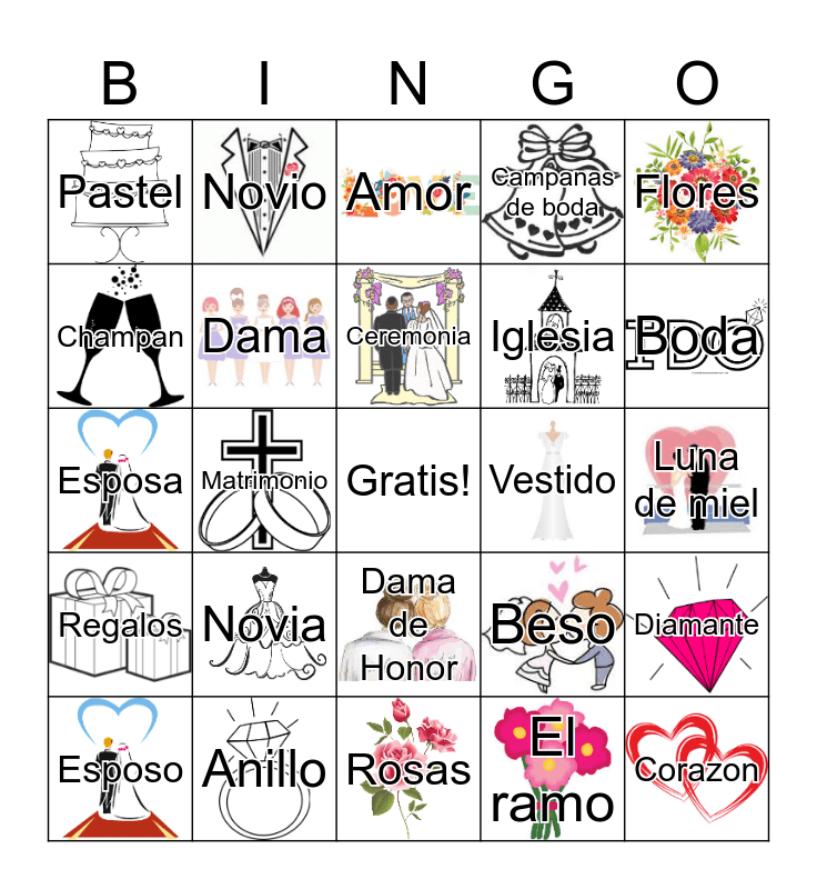 This bingo card has 24 images, a free space and 24 words: Novia, Anillo, Ceremonia, Esposo, Flores, Pastel, Champan, Novio, Vestido, Dama de Honor, Iglesia, Esposa, Beso, Diamante, Dama, El ramo, Luna de miel, Amor, Boda, Matrimonio, Corazon, Regalos, Campanas de boda and Rosas.