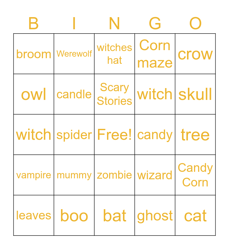 This bingo card has a free space and 29 words: leaves, spiderweb, spider, haunted houses, broom, witches hat, candle, mummy, candy, boo, tree, cat, bat, ghost, skull, pumpkin, zombie, vampire, crow, witch, wizard, dance, witch, owl, Corn maze, Werewolf, Candy Corn, Scary Stories and Witches boots.