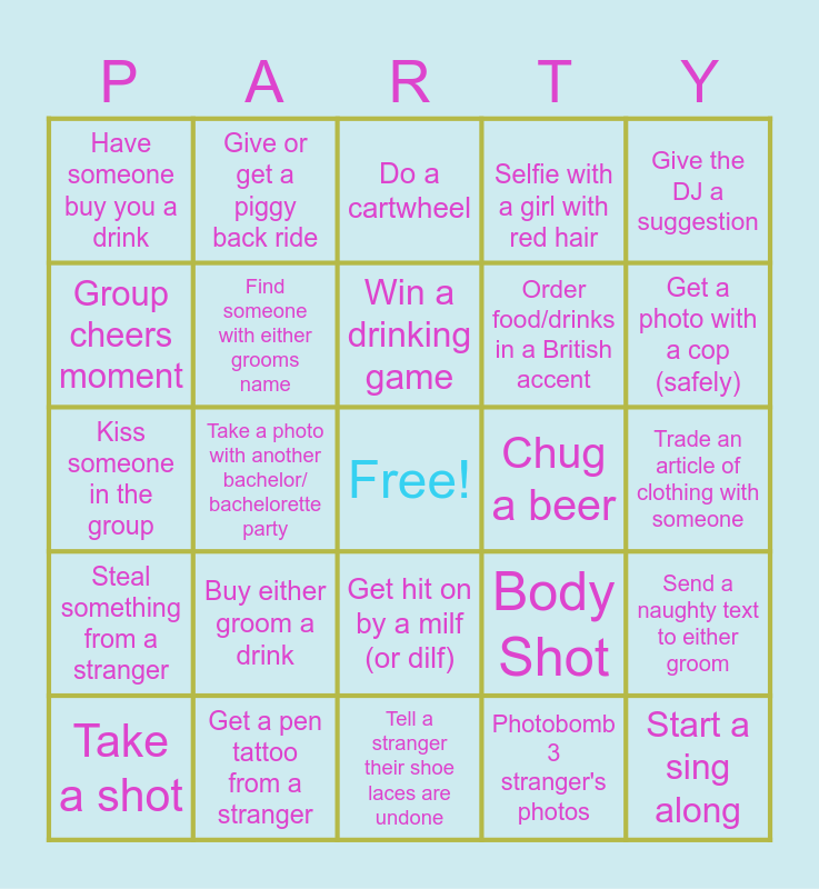 This bingo card has a free space and 29 words: Take a shot, Dance behind someone without getting caught, Take a photo with another bachelor/ bachelorette party, Someone tells a Dad joke, Have someone buy you a drink, Do a cartwheel, Find someone with either grooms name, Buy either groom a drink, Chug a beer, Get a pen tattoo from a stranger, Trade an article of clothing with someone, Start a sing along, Tell a stranger their shoe laces are undone, Photobomb 3 stranger's photos, Get a photo with a cop (safely), Selfie with a girl with a facial piercing, Get hit on by a milf (or dilf), Steal something from a stranger, Give the DJ a suggestion, Kiss someone in the group, Body Shot, Selfie with a bald man, Order food/drinks in a British accent, Group cheers moment, Selfie with a girl with red hair, Give or get a piggy back ride, Send a naughty text to either groom, Win a drinking game and Do 10 pushups.