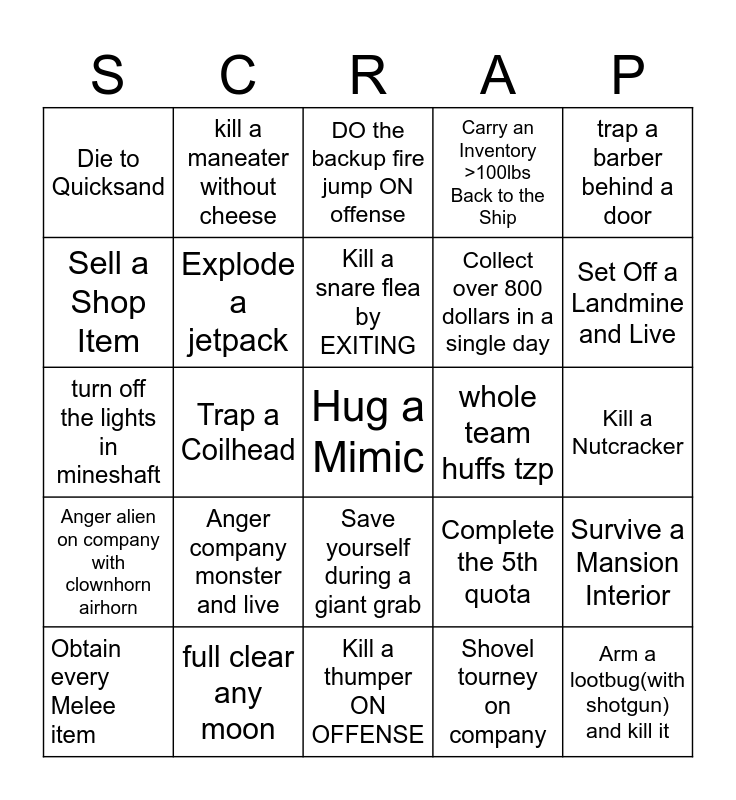 This bingo card has a free space and 24 words: Obtain every Melee item, Anger company monster and live, Kill a snare flea by EXITING, Shovel tourney on company, trap a barber behind a door, Die to Quicksand, kill a maneater without cheese, DO the backup fire jump ON offense, whole team huffs tzp, Kill a Nutcracker, turn off the lights in mineshaft, Explode a jetpack, Complete the 5th quota, Survive a Mansion Interior, Sell a Shop Item, full clear any moon, Kill a thumper ON OFFENSE, Carry an Inventory >100lbs Back to the Ship, Set Off a Landmine and Live, Anger alien on company with clownhorn airhorn, Trap a Coilhead, Save yourself during a giant grab, Collect over 800 dollars in a single day and Arm a lootbug(with shotgun) and kill it.
