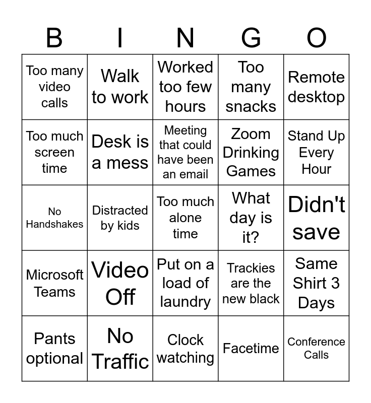 This bingo card has a free space and 74 words: PJs All Day, Kitchen Table Desk, Worked too few hours, Short Commute, Dual monitors, Snuggled My Pet, My Fridge is TOO Close, Full Screen Freeze, Pants optional, Can't figure out Phone Forwarding, Coffee All Day, Heaven for Introverts, Meeting that could have been an email, Too much screen time, Got more done, Distracted by kids, Miss My Office Buddies, Stand Up Every Hour, Call Screening, No Handshakes, Desk is a mess, Walk to work, Too many snacks, Ugg Boots, Conference Calls, Video Calls, Netflix, Long Lunch Break, What's App, Internet out, Remote desktop, Snack Break, Alone time, Call IT Help Desk, No Travel, Facetime, Make a list, Save Petrol, Forgot password, Dining Table Desk, Clock watching, No Traffic, Stay Home Stay Safe, Mute On, Oodie, Too many video calls, Left Something Important In The Office, Video Off, Forgot to take file home, Virtual Happy Hour, Nap Time, Cozy Socks, Didn't save, Zoom, Forgot about a meeting, Made dinner in lunch break, Put on a load of laundry, Too much instagram, Sent funny video to workmate, Same Shirt 3 Days, Zoom Drinking Games, Fancy Zoom Background, Microsoft Teams, Split Screen Work/Movie, What day is it?, What time is it?, Every day is Casual Friday, Work Life Balance, Trackies are the new black, Not enough steps, Get up & stretch, Worked too many hours, Timesheet and Watched too many funny cat videos.