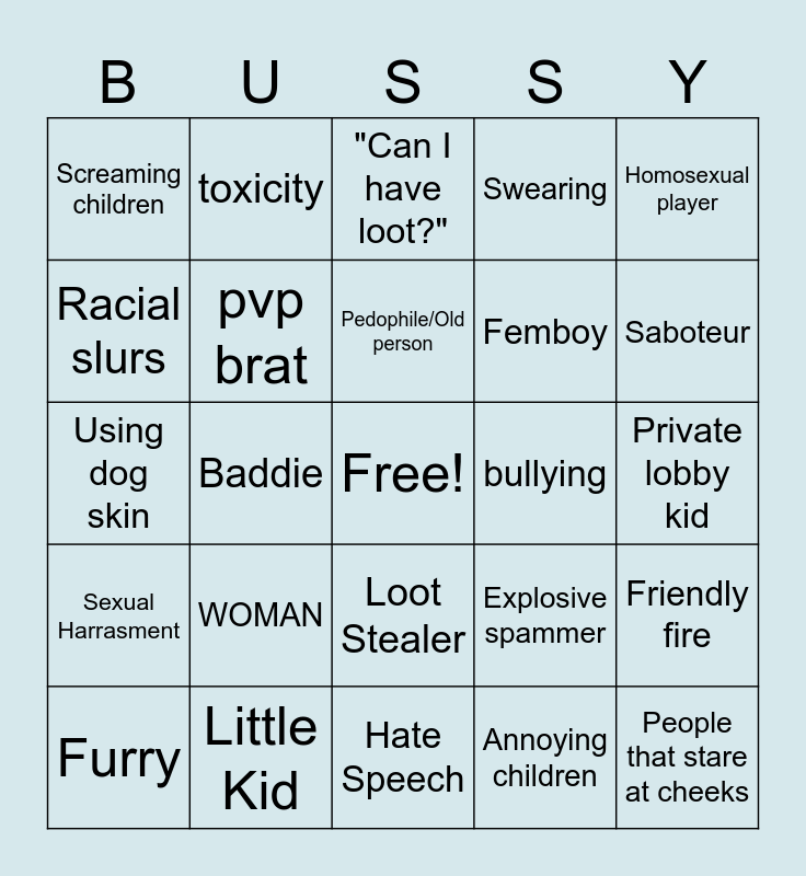 This bingo card has a free space and 24 words: WOMAN, Little Kid, Pedophile/Old person, Furry, Homosexual player, Screaming children, Racial slurs, toxicity, bullying, Loot Stealer, Femboy, Using dog skin, Explosive spammer, Friendly fire, pvp brat, Annoying children, Private lobby kid, "Can I have loot?", Saboteur, Baddie, People that stare at cheeks, Sexual Harrasment, Swearing and Hate Speech.