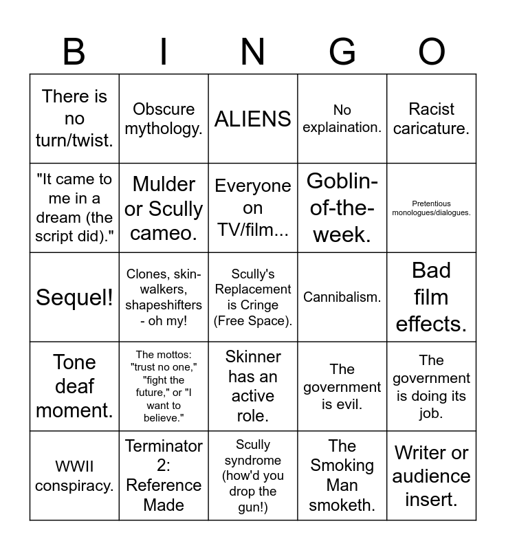 This bingo card has a free space and 24 words: The mottos: "trust no one," "fight the future," or "I want to believe.", Terminator 2: Reference Made, Everyone on TV/film..., WWII conspiracy., Racist caricature., There is no turn/twist., "It came to me in a dream (the script did).", Obscure mythology., Cannibalism., Skinner has an active role., Goblin-of-the-week., Sequel!, The government is evil., The government is doing its job., Mulder or Scully cameo., The Smoking Man smoketh., Bad film effects., ALIENS, Pretentious monologues/dialogues., Clones, skin-walkers, shapeshifters - oh my!, Writer or audience insert., Tone deaf moment., No explaination. and Scully syndrome (how'd you drop the gun!).