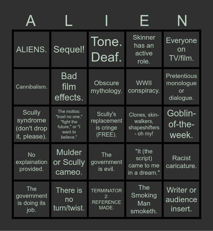 This bingo card has a free space and 24 words: Mulder or Scully cameo., There is no turn/twist., Obscure mythology., The government is doing its job., Everyone on TV/film., ALIENS., Cannibalism., Sequel!, Clones, skin-walkers, shapeshifters - oh my!, The government is evil., WWII conspiracy., Scully syndrome (don't drop it, please)., "It (the script) came to me in a dream.", Racist caricature., Bad film effects., The Smoking Man smoketh., Goblin-of-the-week., Tone. Deaf., Pretentious monologue or dialogue., The mottos: "trust no one," "fight the future," or "I want to believe.", Writer or audience insert., No explaination provided., Skinner has an active role. and TERMINATOR 2: REFERENCE MADE..