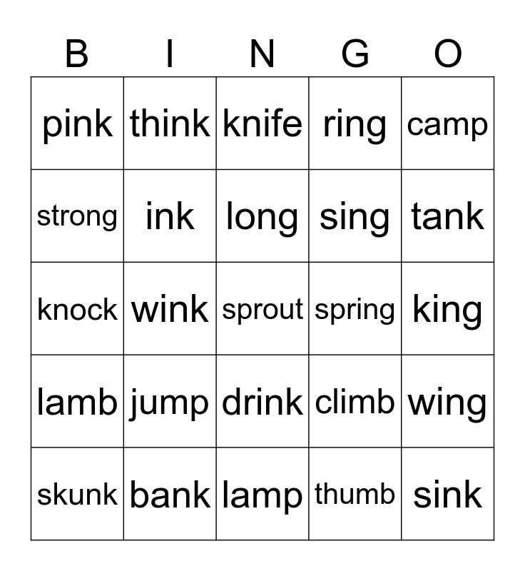 This bingo card has a free space and 24 words: jump, bank, long, skunk, camp, pink, strong, think, spring, drink, sing, knock, climb, wing, ink, thumb, king, knife, tank, wink, sink, lamb, ring and lamp.